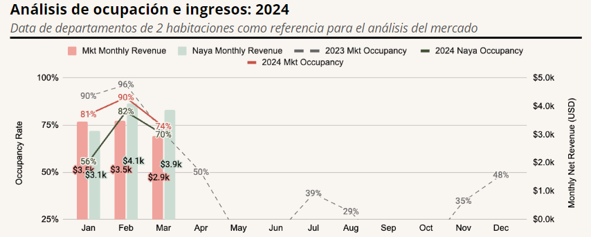 Sin embargo, este incremento en la demanda no ha sido suficiente para mantener las tasas de ocupación, que han experimentado una disminución del 10% interanual. Esta tendencia se explica por un crecimiento más rápido en la oferta, que ha aumentado en un 24% interanual.